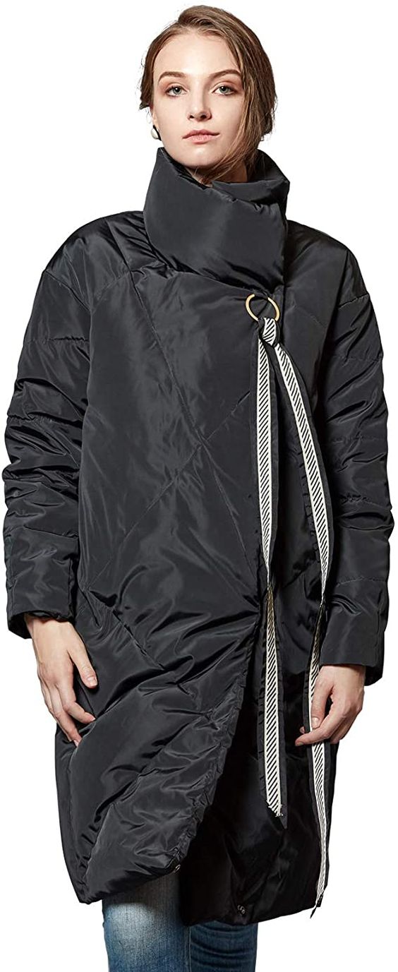 • Unique design, loose fit, fashionable cocoon shape warm coat, stand collar or normal collar decorated with metal hoop and removable ribbon, asymmetrical zipper closure.