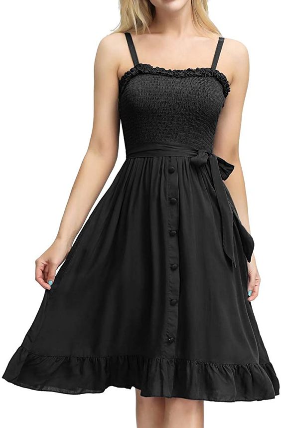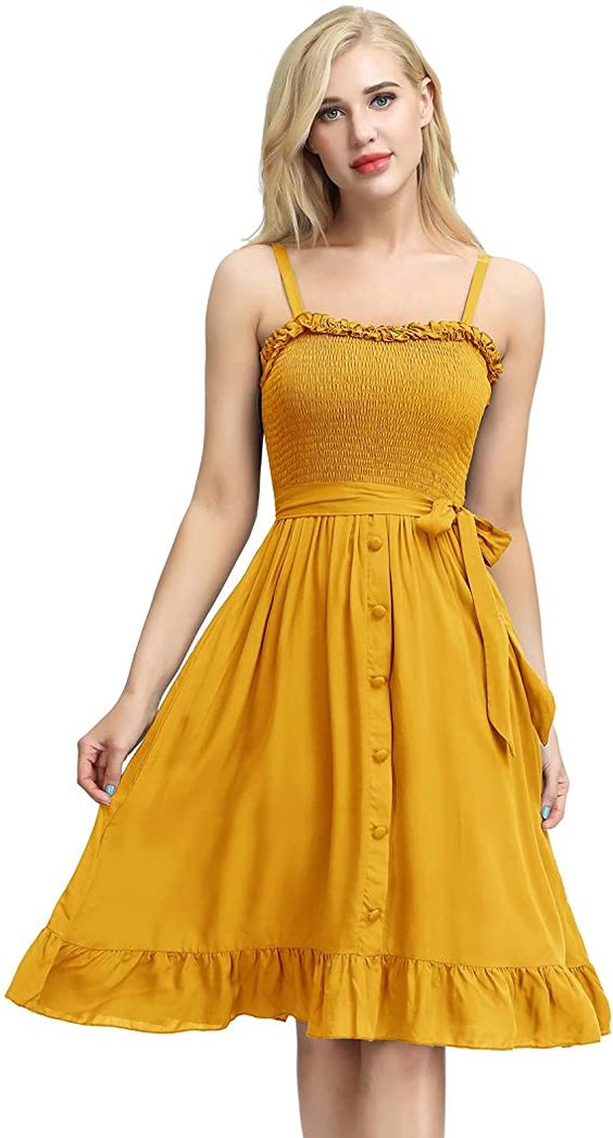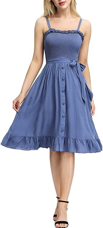 • Feature : Adjustable Spaghetti Straps, Ruffle Neckline, Button Down, Bow Tie Belt, Sleeveless, Midi Dress, Flared A-Line Dress, Boho Dress, High Waist, Sundress, Flowy Dress