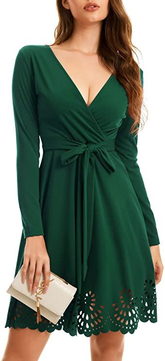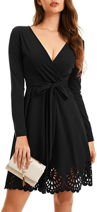 FENSACE Women’s Long Sleeve Cross Neck Scalloped Hem Stretch Knitted A-line Dress