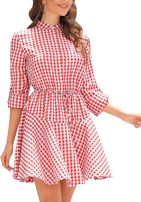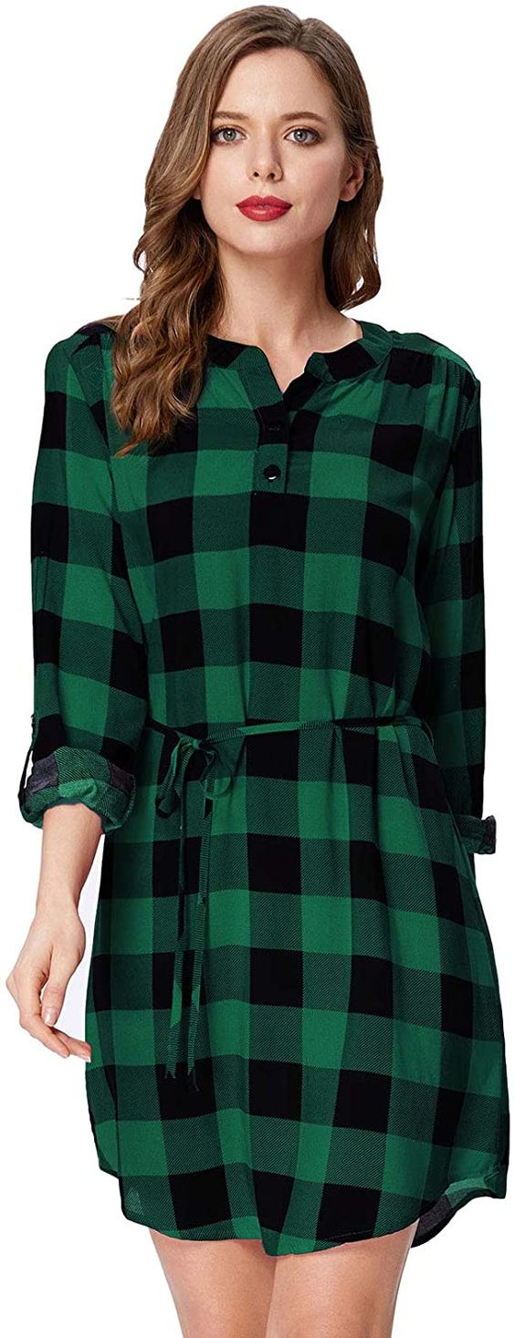 FEATURES – Classical plaid dress never outdated, button down, roll-up sleeves, elastic waist with belt, patchwork A-Line swing dress.