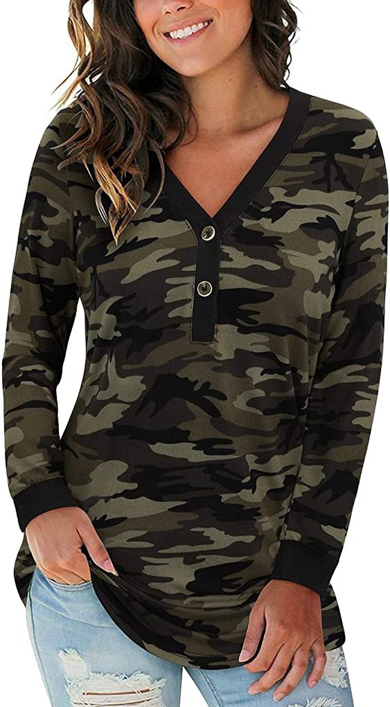 Leopard Print/Camo Print/V Neck Casual Tops/Button Down Henley Shirt/Long Sleeve/Pullover Tunic/This women long-sleeved top uses camo leopard print, button elements, and a perfect streamlined cut. It is easy to mix and match. The Women Tunic is almost the same as any casual or wearing outfit you are wearing, but this top can make you look thinner. You become a confident woman