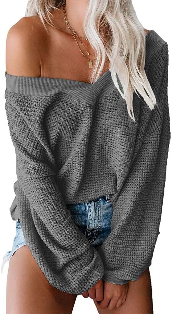 Tobrief Women’s V Neck Long Sleeve Waffle Knit Tops Off Shoulder Oversized Pullover Sweater