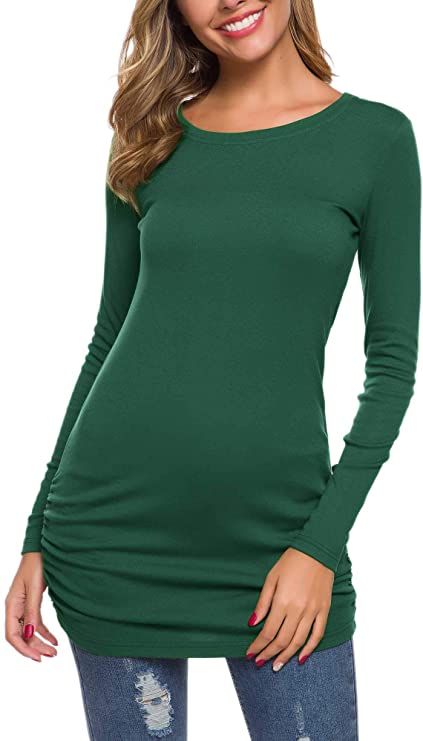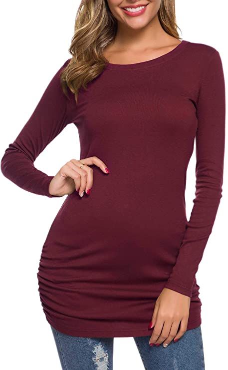 • Fetures:Long sleeve,Slim-fit,Scoop neck,Basic Solid color,Side Shirring.Ruched sides Curve hem.
