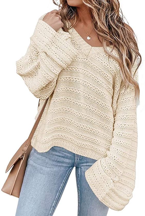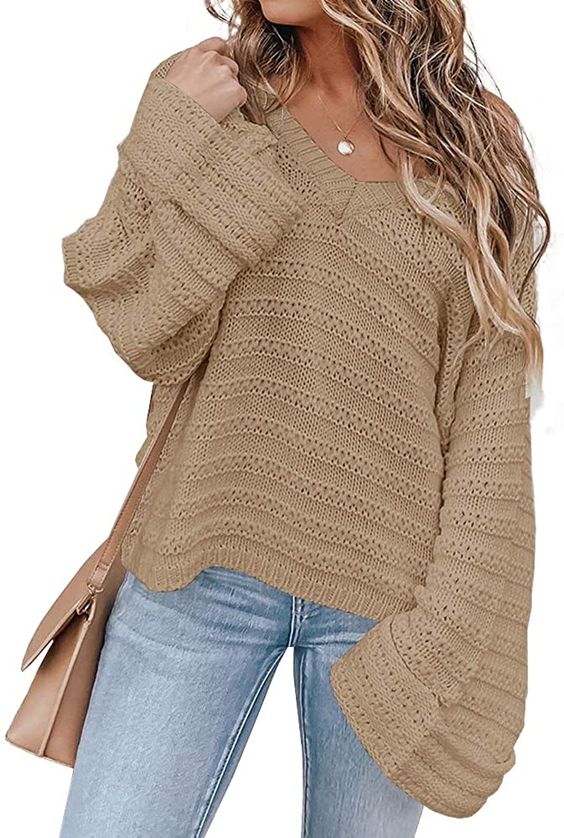Tutorutor Womens V Neck Long Bell Sleeve Pullover Sweaters Oversized Batwing Loose Fit Strip Knitted Jumper Blouse Tops