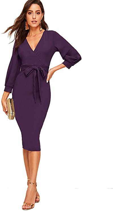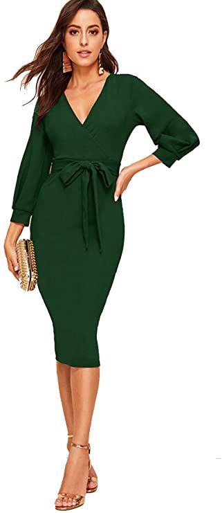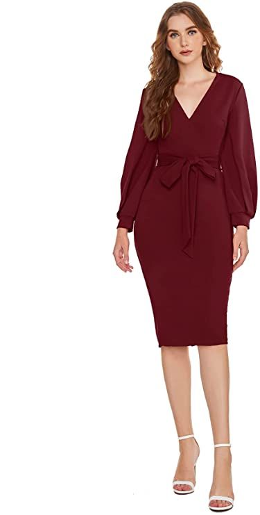 Verdusa Women’s Plunging V Neck Bishop Sleeve Bodycon Belted Dress