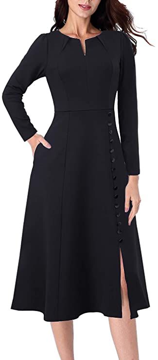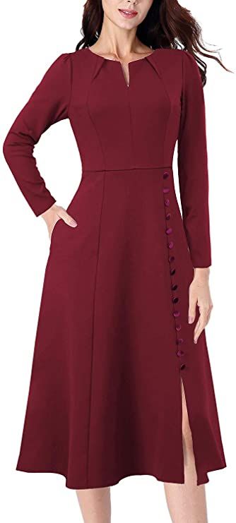 VFSHOW Women Pleated Neck Pockets Buttons Work Office Business A-Line Midi Dress