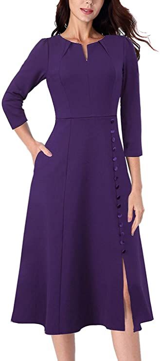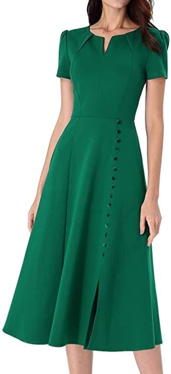 Style: Pleated Notch V Neckline, Short Sleeve, Puff Shoulders, Two Handy Pockets, Decorative Buttons, Front Slit, A-Line Silhouette helps hide body imperfection well, A Concealed Back Zipper.