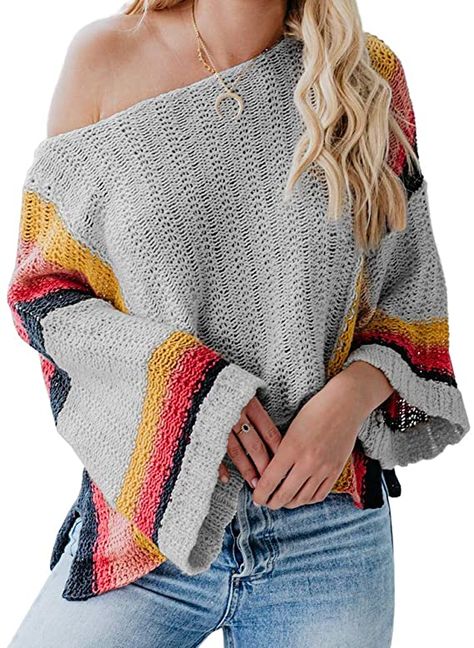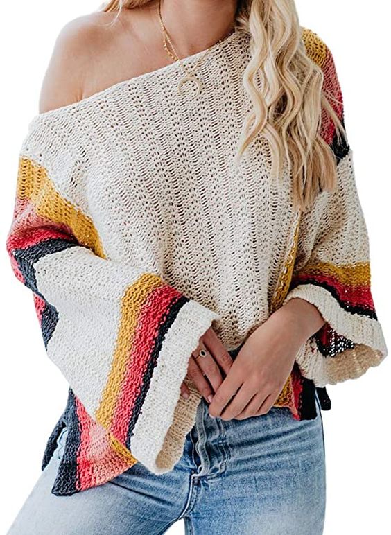 Womens Off The Shoulder Oversized Lightweight Sweaters Color Block Batwing Knit Fall Pullover Jumper Top