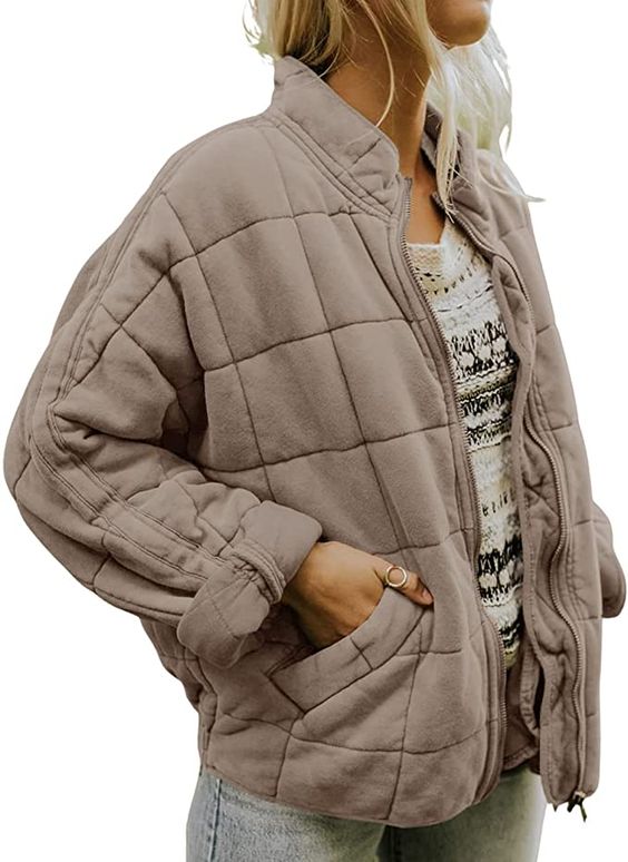 Women’s Quilted Lightweight Jackets Loose Long Sleeve Zip Up Cotton Casual Winter Outerwear with Pockets Coat